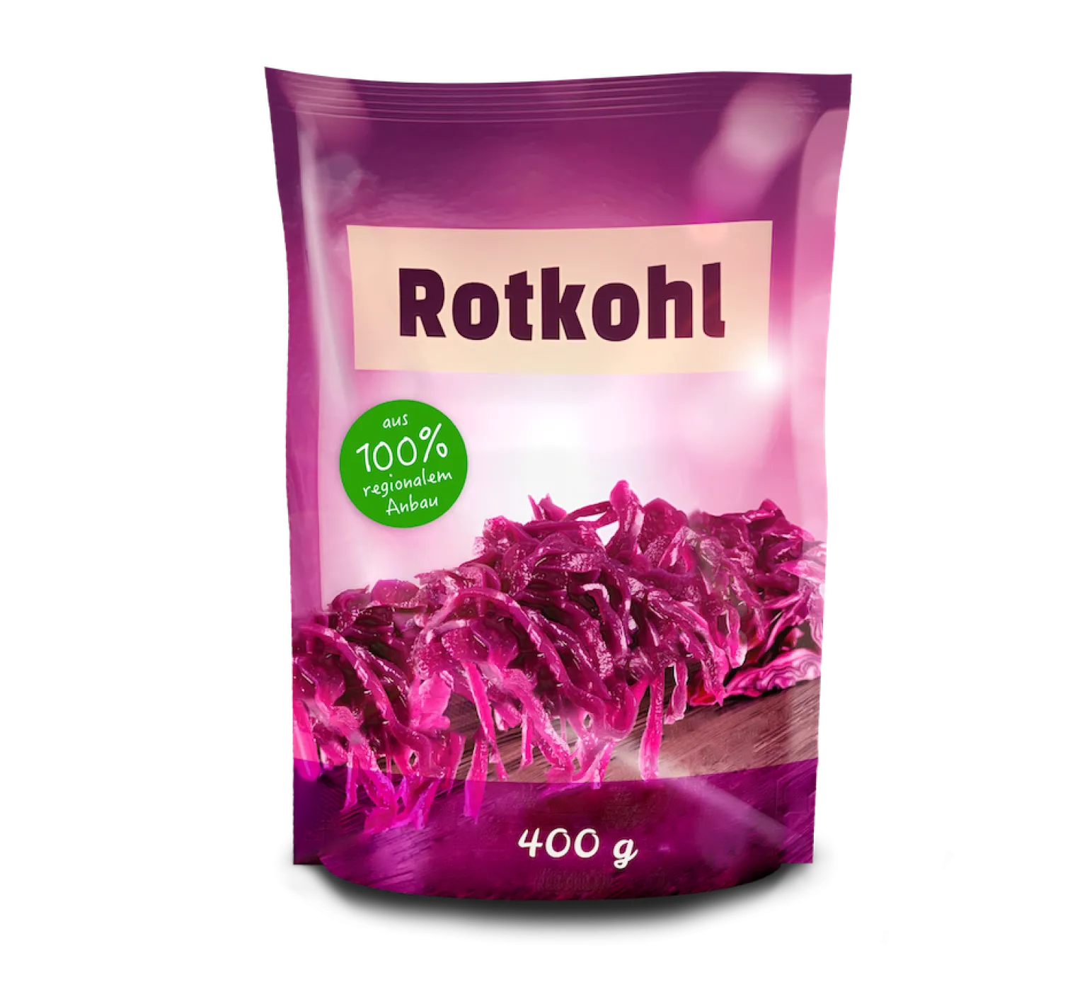 Um ein 350g-Glas für Rotkohl herzustellen, benötigt man 31,1 g Material pro kg verpacktes Produkt. Für einen 400g-Beutel nur ressourcen-schonende 17,1 g.